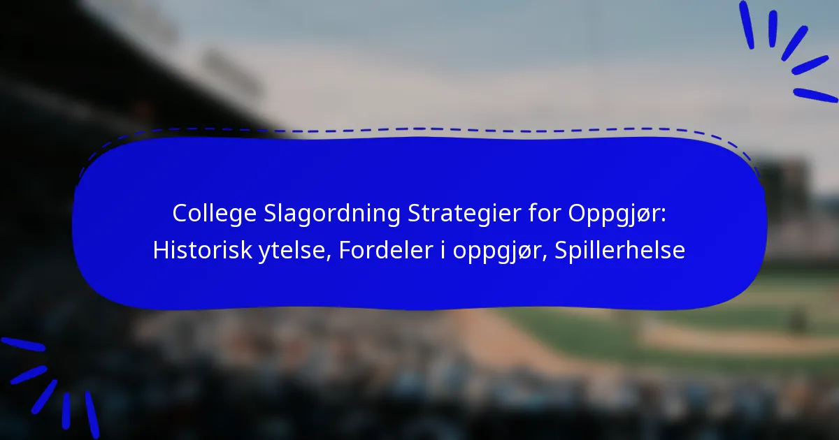 Strategier for slagrekkefølge i college påvirkes av flere nøkkelfaktorer, inkludert historiske ytelsesmålinger, fordelaktige oppgjør, spillerhelse, typer motstanderpitchere og lagdynamikk. Å forstå disse elementene hjelper trenere med å optimalisere oppstillingene for bedre kampresultater.